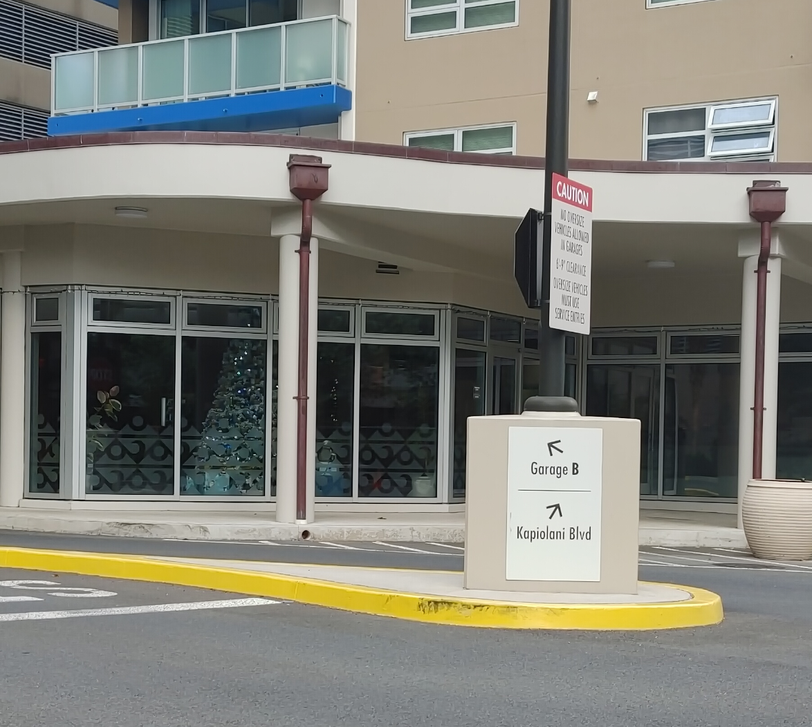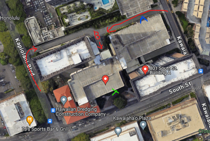People who want to use the parking structure, you will need to drive around to the back of the building to find Garage B. There is a back road that is connected to Kapiolani and Kawaiahao that leads to the garage. Pictures below for reference.